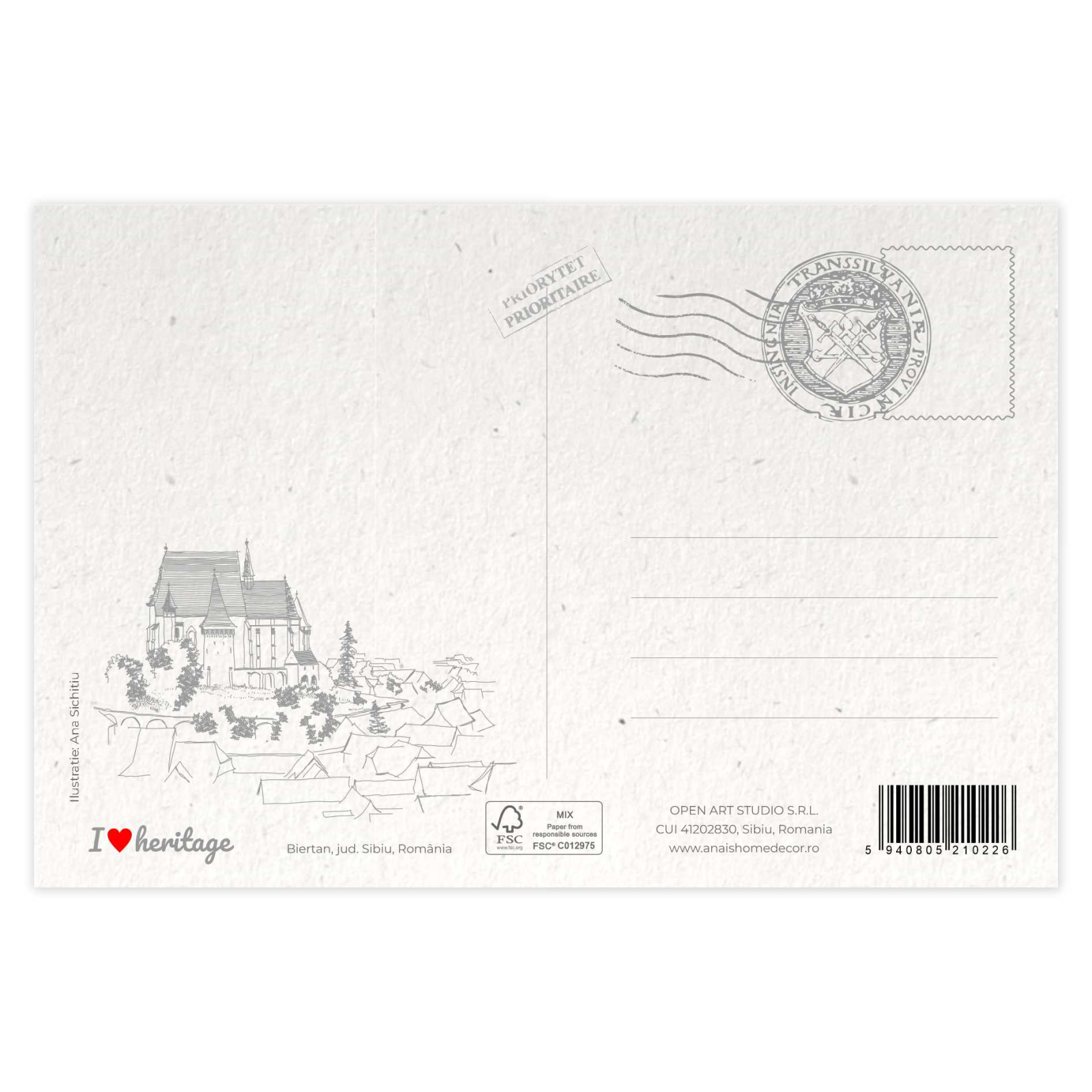 Carte postala cu ilustratie originala, tiparita pe carton reciclat.