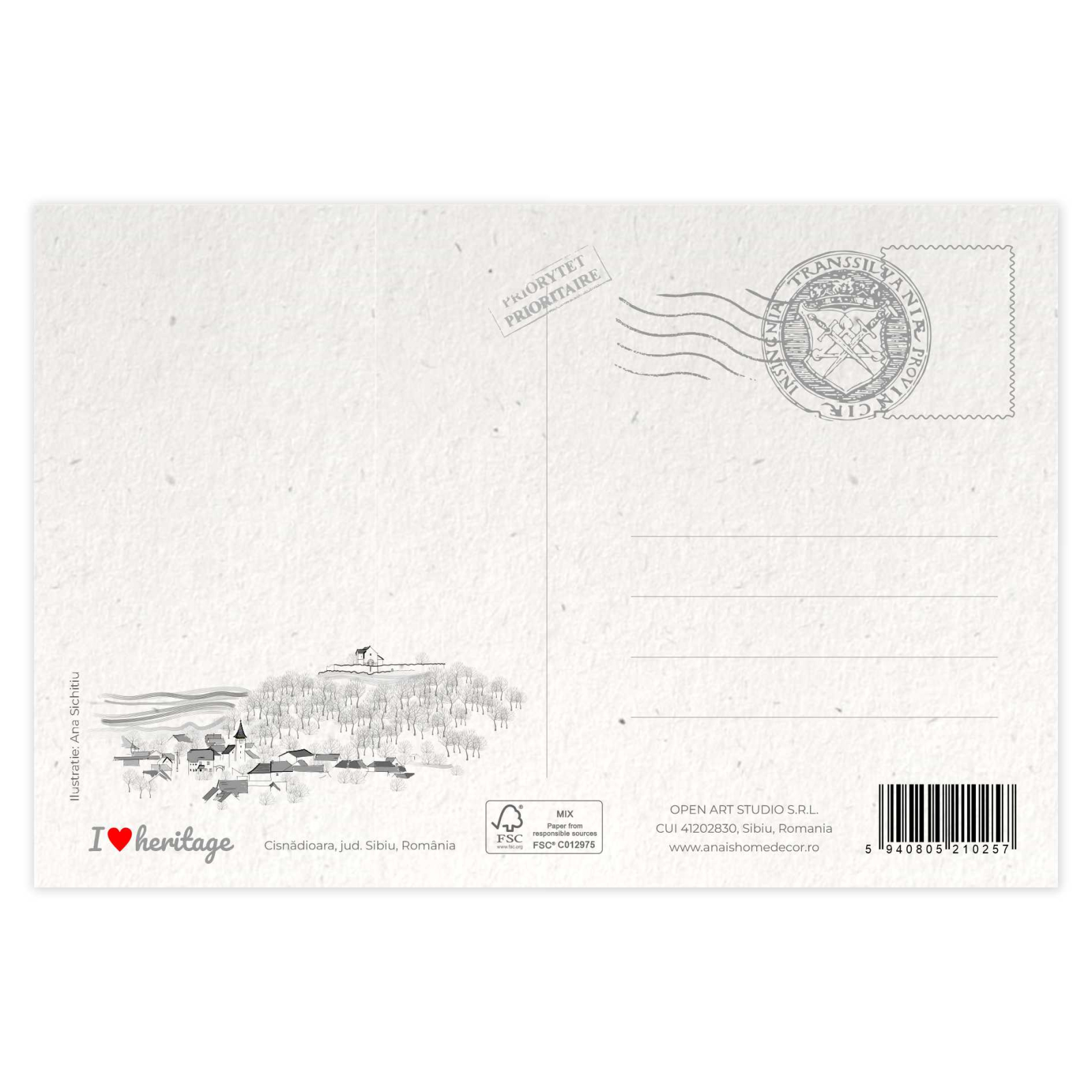 Carte poștală din colecția I ❤️ Heritage, dedicată promovării patrimoniului construit al României. Este realizată pe hârtie certificată FSC, provenită din surse responsabile, cu un conținut de 30% reciclat pentru un impact mai mic asupra mediului.